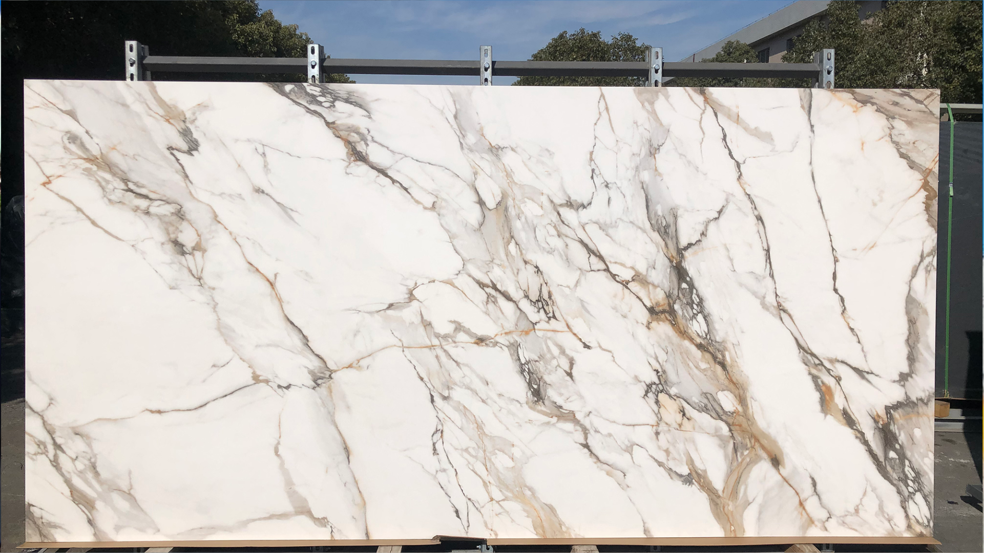 Calacatta Luxury, placa de piedra tecnológica de color blanco con vetas doradas y cobrisas, ideal para tu cocina por su resistencia y precio.